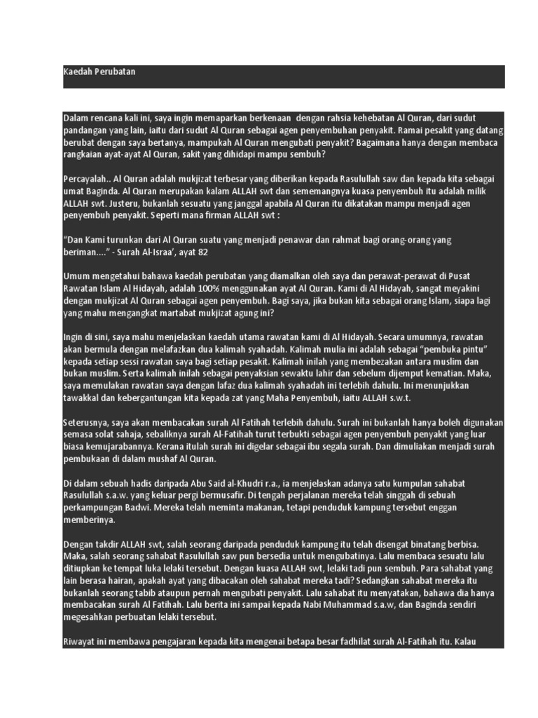 Tiada penyembuhan ( rawatan khusus ) dalam penagihan hanya kaedah untuk mengekalkan kepulihan. Bersihkan diri dari dadah dari hari kehari (one day at the time) tanpa pilihan dengan melazimkan diri. Sekiranya perlu, telefon selepas mendapat sms. Pusat rawatan al idrus, kuala lumpur, malaysia. Lame kan,kita kena banyak bersabar la bile nak sembuh. (di atas ssm temerloh, berdekatan public bank, tapak pasar lama) perawat: A) pakej master mahar tenaga dalam ilahi tahap master , mahar asal rm550 tidak termasuk keilmuan lain. Posted by klinik al hidayah at 8:44 pm 3 comments walaupun rawatan di rumah tidak dapat menghentikan prostat daripada membesar, ia mungkin membantu mengurangkan atau mengawal gejala. Dalam kenyataan ringkas yang sama juga, ashraf muslim dikhabarkan telah juga meletak. Penyakit jantung ini tidak memilih jantina ataupun peringkat umur. Kenyataan terbaru dari laman web rasmi pusat rawatan islam al hidayah menyebut yang ashraf muslim telah pun meletak jawatan daripada menjadi perawat dan ketua operasi (coo) pusat rawatan islam itu. Tapi disebabkan masalah yg tak dapat dielakkan. Pusat rawatan kiswah terapi ruqyah syariyyah: